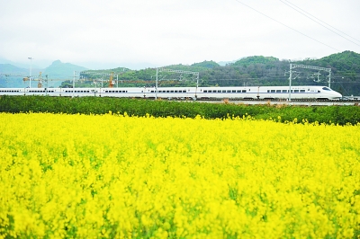 早春时节,贵州省黔东南苗族侗族自治州境内的油菜花陆续盛开,列车穿行其间,美不胜收。新华社发