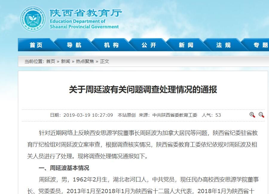 据陕西省教育厅官网3月19日消息,针对近期网络上反映西安思源学院董事长周延波为加拿大居民等问题,陕西省纪委驻省教育厅纪检组对周延波立案审查,根据调查核实情况,陕西省委教育工委依纪依规对周延波及相关人员进行了处理。现将调查处理情况通报如下。