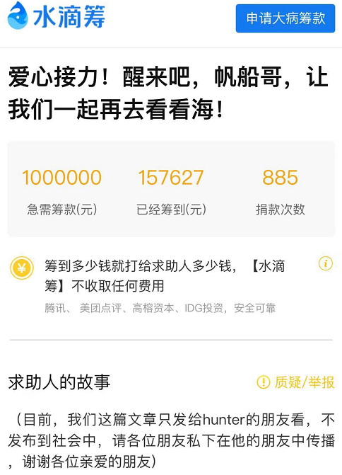 近日,在众筹平台“水滴筹”上的一则个人筹款求助引来热议,题为“爱心接力!醒来吧,帆船哥,让我们一起再去看看海!”的求助帖中,讲述了主人公罗先生遭遇车祸陷入昏迷,需要百万医疗费用的故事。文中介绍道,罗先生曾是雅虎、阿里高管,后来心怀梦想投身帆船事业,发起人希望呼唤认识罗先生的朋友加入筹款。前阿里高管、帆船玩家在普通人心中往往是财力雄厚的代名词,出现在“水滴筹”平台上,让不少网友觉得对比非常强烈,引发是否真的需要捐款的质疑。今日,扬子晚报紫牛新闻记者从水滴筹方面了解到,目前这篇筹款求助已经被中止,善款将原路返回。