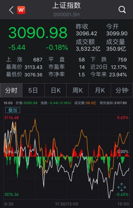 截至收盘,沪指报3090.98点,跌0.18%,成交3532亿元;深成指报9839.74点,跌0.04%,成交4224亿元;创业板指报1708.87点,涨0.11%,成交1168亿元。
