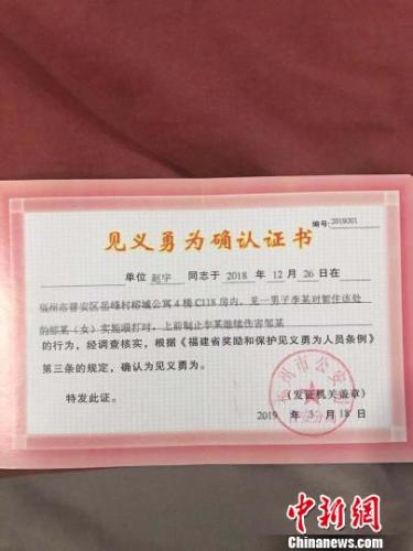 中新网福州3月19日电 (郑江洛)19日下午,福州警方来到赵宇家中,为其颁发见义勇为确认证书,认定其见义勇为行为。