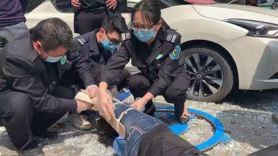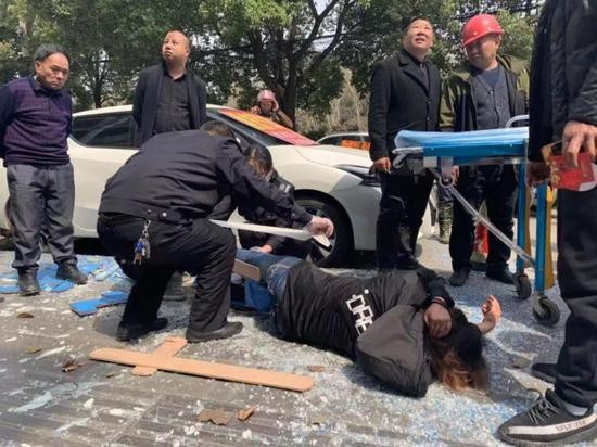 11点50分,记者赶到现场,发现受伤女子仍然躺在碎玻璃处,医护人员已经赶到现场,正在对该名女子的左腿进行支架外固定。