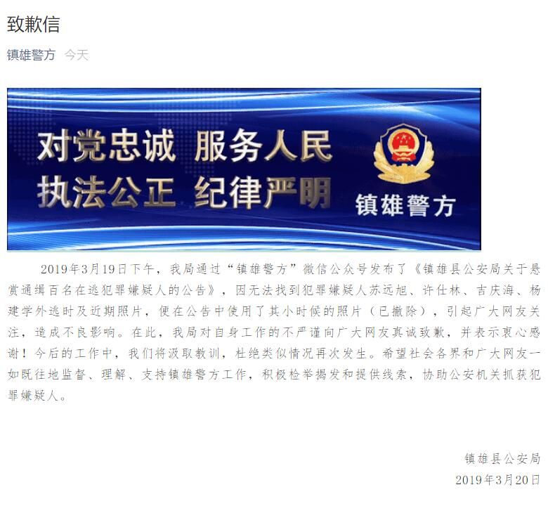 20日凌晨,镇雄县公安局就通缉照一事发表《致歉信》称,因无法找到犯罪嫌疑人苏远旭、许仕林、吉庆海、杨建学外逃时及近期照片,便在公告中使用了其小时候的照片(已撤除),引起广大网友关注,造成不良影响。