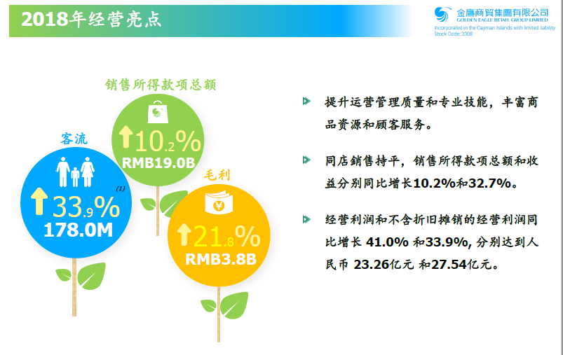2018年,金鹰世界实现销售所得款项总额人民币591.2百万元,毛利额人民币171.6百万元,经营利润人民币108.5百万元。金鹰世界正呈现出一个全方位的生活、社交、娱乐、服务为一体的新零售平台和生活空间。