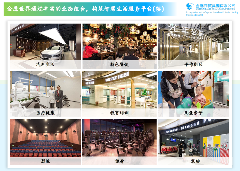集团董事长王恒先生表示:“展望未来,我们对中国的零售市场充满信心。2019年,金鹰商贸集团将顺应主力消费阶层的消费升级需求,并优先发展客户体验性强、业绩增长潜力大、毛利水平高的业态和品类,增加儿童体验、母婴、健康、生活旅游、家居、文创等方面的生活业态,打造适合家庭购物休闲聚会的全生活商业中心。此外,集团将透过新内容、新渠道和新会员等核心资源,形成满足长远发展需要的核心轻资产运营和服务能力。集团亦通过有效运用一系列全渠道方式,如“掌上金鹰”移动客户端、微信、微博、电子VIP卡等,将全生活中心、7-Eleven便利店以及产业链上下游资源,与“金鹰购”上渠道深度整合,并嵌入多种优质便捷的全生活服务内容,促进全平台的综合客流量及经营业绩的快速增长。金鹰世界近百万平方米的综合体将于2019年9月30日试业。届时,金鹰世界酒店G·Hotel、We Work共享办公及金鹰健康中心等及众多功能业态同步呈现,为金鹰实际裙楼带来大量长期优质客流。