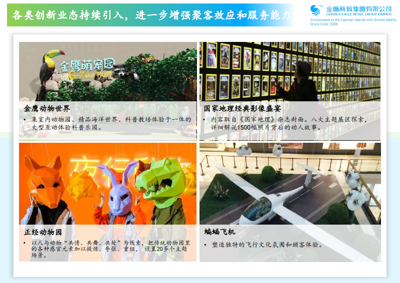 金鹰世界自开业以来,已成为华东地区乃至中国的城市商业新地标。年内在原有强大品牌阵容和丰富业态基础上,新增众多潮流服饰品牌和网红餐饮,并持续引入各类创新业态,其中金鹰动物世界是金鹰商贸集团创新设立的室内大型互动体验科普乐园,其与正经动物园以及国际地理经典影像盛宴等一起,将于2019年暑期开业。
