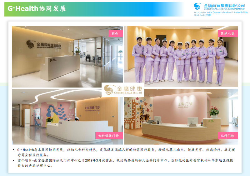 与此同时,除了通过满足顾客消费升级需求相关的G·Mart、G·Beauty、G·Takaya等的G系列特色商业,金鹰商贸集团于2018年下半年战略投资致力发展“世界知名IP+科技体验”的创新型儿童室内主题乐园的荷兰iP2儿童室内主题乐园开发商。此外,金鹰教育、金鹰健康医疗等则构成集团平台化发展的新内容,以金鹰健康医疗为例,其以妇儿专科为特色,定位满足高端客户群的特需医疗服务,提供从婴儿出生、健康发育、疾病治疗、康复理疗等全程医疗服务,其首个项目将于2019年3月28日试营业。
