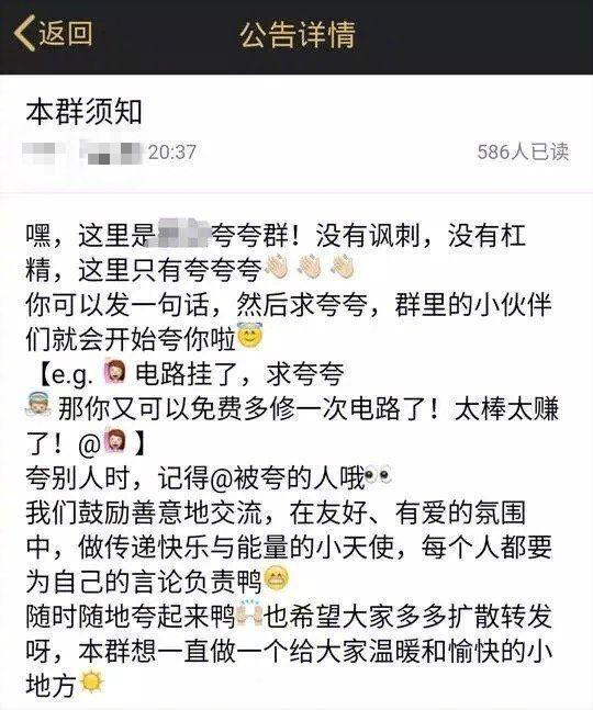 一名“夸夸群”群主是这样描述建群初衷的:“‘夸夸群’的最初目的是让我们学会赞美别人,并自信地接受别人的赞美。用心去肯定和支持他人。”