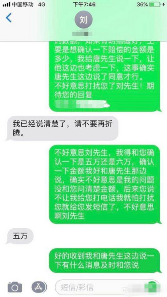 2018年12月,唐文给刘江发去“提前解约”通知,但对方表示自己事情多、很忙,不愿意考虑别人的事情,还附送一句霸气回应,“废话多,别打搅!”
