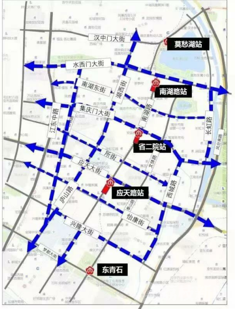 1、施工期间南湖路(水西门大街至蓓蕾街段)将禁止机动车通行,车辆于南湖路西侧可绕行湖西街、东侧可绕行长虹路-集庆门大街-文体路;