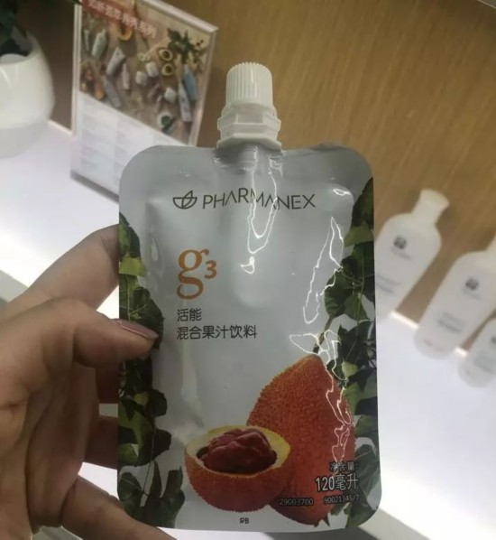 在店内的产品展示区,g3活能混合果汁饮料也赫然在列,旁边卡片上写着“保健品不等于药物”。