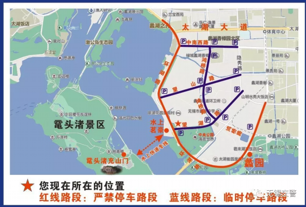 ▲交通管制期间,进出鼋头渚景区的车辆可从鼋渚路——充山大门或渤公岛——犊山大坝——犊山大门分别通行。