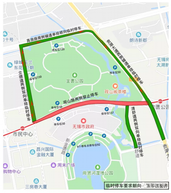 金匮公园内停车场有370个停车位,观山路市政府西侧停车场有50个停车位,东侧停车场有137个停车位,新金匮路停车场有92个停车位。