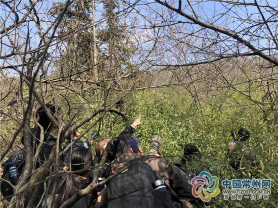 观测活动刚开始就偶遇“小虎”,大家情绪高涨,纷纷跨过一丛荆棘来到一棵桃花树旁,拿起单反拍摄。“野外这样孤芳自赏的桃花就是‘小虎’非常喜欢的蜜源,肯定能见到‘小虎’。”章丽晖说完,也跟了上去,全然不顾被小刺刺到。