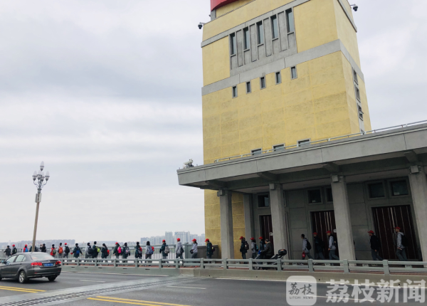 中午12点,队伍来到了长江大桥,学生们边走边给骑电动车的市民发帽子,提醒大家降低车速。学生刘俊贤说,长江大桥是31公里中他最期待的点。“长江大桥是新修的,非常壮观,以往都是坐车子上去的。这次徒步走大桥,感受大桥雄伟壮观。我们上午走了11公里左右,实际上我的腿已经很酸了,但是这是对我的自我挑战,接下来的路更加精彩。”