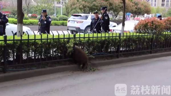这是一头雄性野猪,约120斤,身上有伤痕,在马路上到处乱窜,就在市民报警后不久,这头野猪慌不择路,一头窜进绿化护栏的缝隙,被卡在护栏上,可很快,野猪垂死挣扎,居然挣脱缝隙又窜到了马路上,而且兽性大发,赶来的民警赶紧用捕狗工具将其控制。