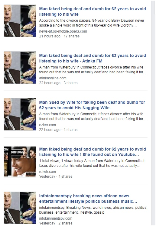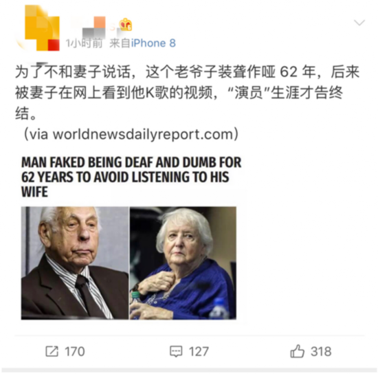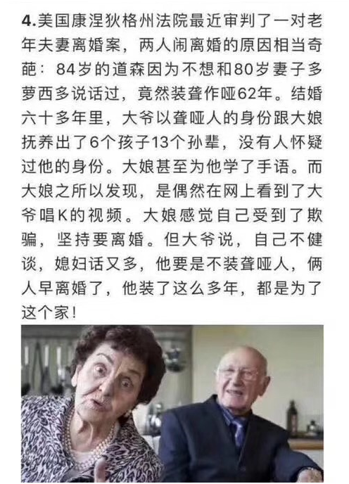 “世界新闻日报”网站文章说,“一位来自康涅狄格州沃特伯里的男子在其妻发现他实际上并不是真的耳聋后就和他离婚了。为了不听妻子说话,这名男子已装聋作哑超过62年。”