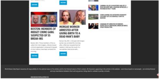 “‘世界新闻日报’对其文章的讽刺性质及其内容的虚构性质承担全部责任。本网站文章中出现的所有人物角色都是完全虚构的,即使是基于真人的。这些角色与任何人、生者、死者或亡灵之存在的相似之处都纯粹是奇迹。”该网站的免责声明写道。