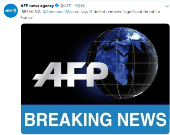 马克龙发推文表示,“对我国的重大威胁”已经“消除”,同时警告说,“威胁依然存在,打击恐怖组织的斗争必须继续下去。”