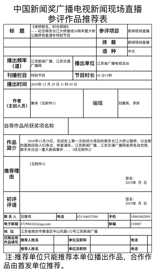 2、作品创新、构思独到。作品将南京长江大桥公路桥恢复通车、南京长江大桥建成50周年、改革开放40周年三个重要事件节点,有机融合在一起,使其产生了巧妙的化学反应。通过讲故事、摆数据等方式,清晰勾勒出大桥在共和国发展历史中参与者、见证者、贡献者的多重角色,定位准确,有说服力也有感染力,具有一定的开创性。