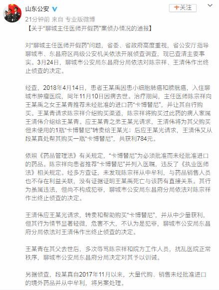 对“聊城主任医师开假药”问题,省委、省政府高度重视,省公安厅指导聊城市、东昌府区两级公安机关依法开展侦查调查,现已查清主要事实。3月24日,聊城市公安局东昌府分局依法对陈宗祥、王清伟作出终止侦查的决定。