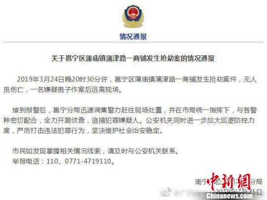 中新网南宁3月25日电 (记者 张广权)3月24日晚,广西南宁市邕宁区蒲庙镇蒲津路一珠宝店发生抢劫案件。