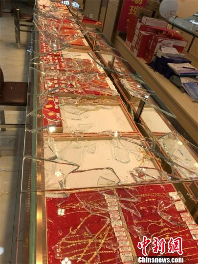 随后,男子持器械打烂玻璃柜台,劫走金项链、金手链和金吊坠等大量金饰。整个过程约60秒。