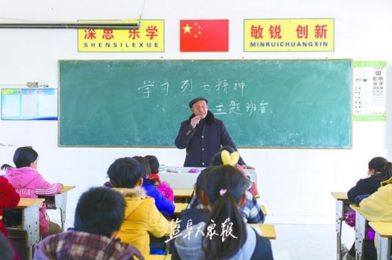 3月13日,记者走进了滨海县天场镇秦桥村,正好赶上离村部不远的吴姚小学五年级(一)班在开主题班会,一位老人正在给学生们讲话。吴姚小学教导主任戴能老师告诉记者,台上的老人叫朱善祥,他正在讲述牺牲在这里的吴永光、姚木清两位烈士的英勇事迹。