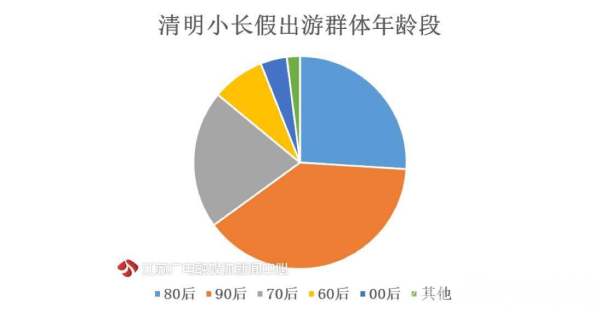 从年龄结构来看,90后已成清明小长假出游主力军,占比为39%。80后紧随其后,占比为26%,比70后高了5个百分点。另外,00后占比快速上升,以4%的占比位居第五。