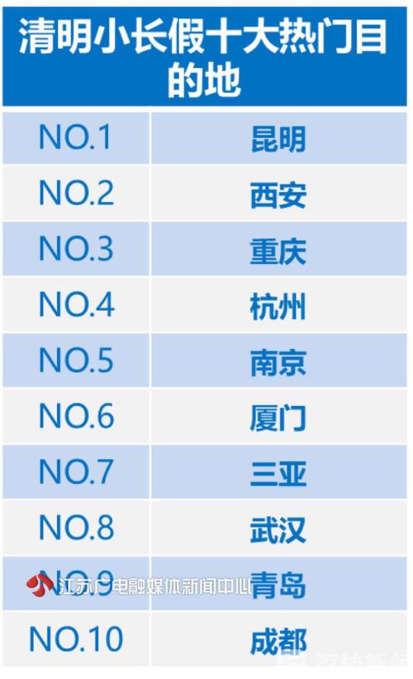 根据大数据分析,清明小长假人气最高的十大目的地分别为昆明、西安、重庆、杭州、南京、厦门、三亚、武汉、青岛、成都。出境游方面,日本、越南、泰国、马来西亚、中国香港等短途目的地依旧受欢迎。