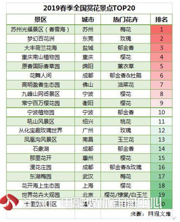 每年春季总有一批旅游景区因为花而游客盈门。数据显示,进入3月份以来,梅花、樱花、玫瑰花、郁金香、油菜花等春节人气花卉的花期相继到来,相关的旅游景点成为人们周末踏青赏花的首选。3月份以来,苏州光福香雪海、东莞梦幻百花洲、盐城大丰荷兰花海、重庆南山植物园、绵阳原香国际香草园、成都花舞人间等主打赏花游的景区每逢周末都是游客盈门,个别“网红”赏花景区甚至还吸引了大批长线游客前往赏花。厦门、广州等地的大部分赏花景点当前正是百花齐放时节,各类花卉争奇斗艳,吸引了大量游客。
