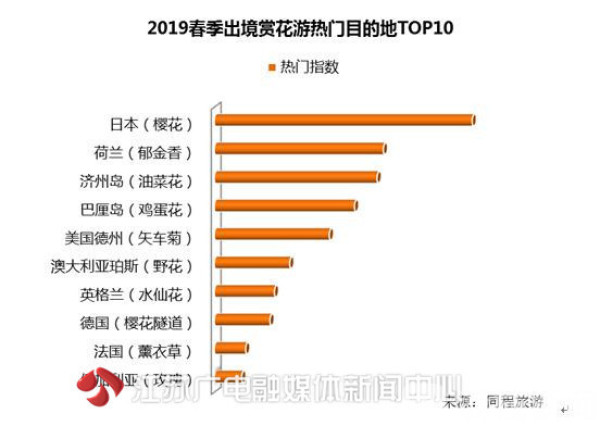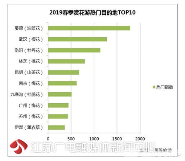 今年春季赏花游最热门的十大花卉,樱花依然高居榜首。3月中下旬以来,国内的武汉大学、无锡鼋头渚、北京玉渊潭公园、南京鸡鸣寺等“网红”赏樱地吸引了大量游客,日本东京、福冈、熊本等正值樱花盛花期的目的地也成为人们近期出境赏樱的首选。排名第二的是油菜花,婺源篁岭依然是最具人气的油菜花观赏地,相关的旅游线路持续热卖。排名第三的是桃花,有“世外桃源”之称的西藏林芝是最受欢迎的桃花观赏地。