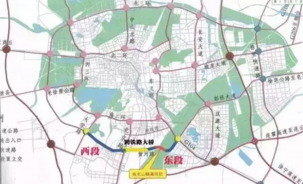 黄河路贯通工程连接新城区和铜山区,起于迎宾大道和彭祖大道交叉口,沿既有彭祖大道向西南至纬十六路,转向西经曹山与段山之间穿越拖龙山,再向西跨过京沪铁路,止于大学路,全长约11.57公里。