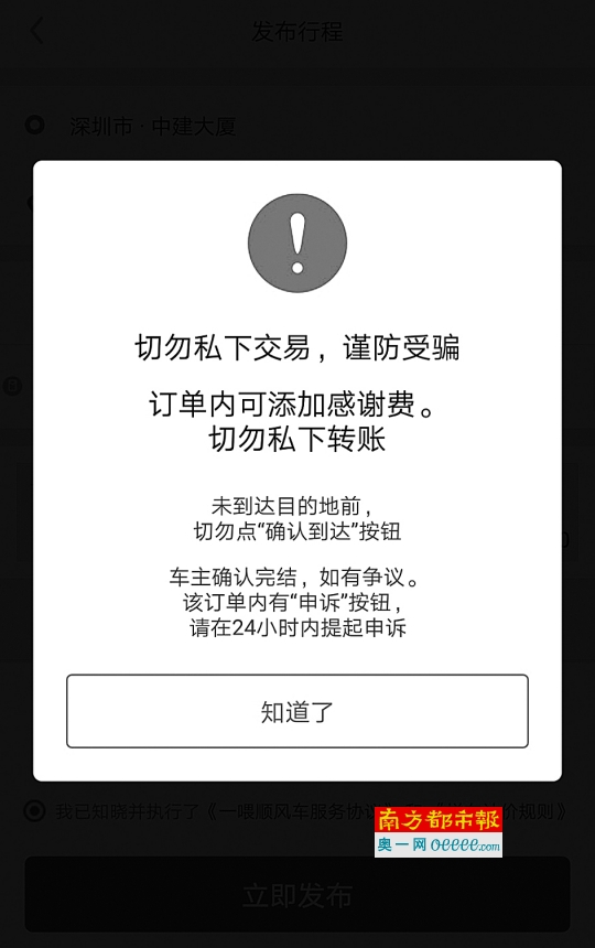 “一喂顺风车”平台下单前的提醒。