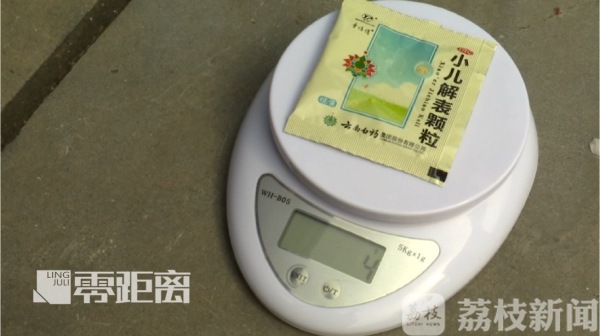 那么,这款云南白药小儿解表颗粒冲剂每袋究竟是4克还是8克呢?随后,记者通过电子秤称重,发现每袋重量都显示为4到5克,并非小袋包装背面显示的8克。记者就此问题电话联系了云南白药集团股份有限公司的客服。