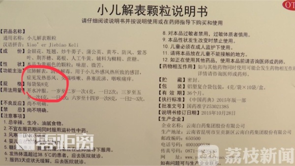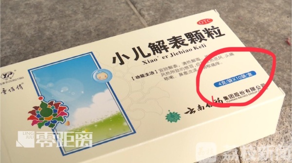 近日,南京市民高女士告诉记者,她一岁大的孩子这两天患了感冒,她在正规药店购买了一盒云南白药小儿解表颗粒。就在她准备给孩子服药时,却发现药品内外包装上显示的每袋剂量完全不同。