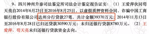 自2014年6月23日至2016年8月25日止,王爱萍以大竹县光亮商贸责任有限公司名义贷款12笔,累计贷款金额1.58亿元;以大竹县云帆商贸有限公司名义贷款2笔,累计贷款金额5980万元;以大竹县天府鹏辉商贸有限公司名义贷款9笔,累计贷款金额8770万元;利用达州市通川区华望塑料有限公司留存在工商银行贷款资料,以其名义贷款4笔,累计贷款金额8780万元,共计贷款27笔,累计金额3.94亿元。