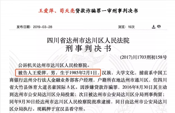 裁判文书网披露的信息显示,被告人王爱萍,男,生于1985年2月1日,汉族,大学文化,捕前系中国工商银行达州分行法人金融业务部客户经理,其对自己分管的客户贷款资料、项目评估资料、抵(质)押物(权)及其他资料,有收集、系统录入及报送审批的职责。
