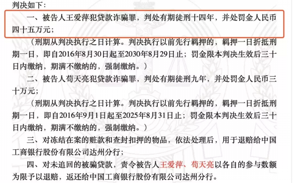 法院表示,王爱萍以非法占有为目的,采用虚构事实和隐瞒真相的方法,多次骗取中国工商银行股份有限公司达州分行贷款8780万元,数额特别巨大,至今未归还;其中,苟天亮以非法占有为目的,骗取贷款金额1000万元,数额特别巨大,至今未归还,二人行为均构成贷款诈骗罪,依法应予刑事处罚。根据两人的犯罪事实、性质、情节和对金融机构造成的危害程度等,依法判决如下: