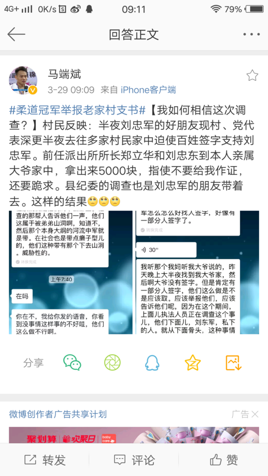 3月29日,国家柔道队现役运动员马端斌再次在微博上发表信息,称“村民反映:半夜刘忠军的好朋友现村、党代表深更半夜去往多家村民家中迫使百姓签字支持刘忠军”。