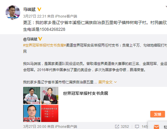 此前,他在微博上举报实名举报他的家乡辽宁省本溪市桓仁县五甸镇桦树甸子村两任村书记贪腐、套取国家扶贫基金1000万元。