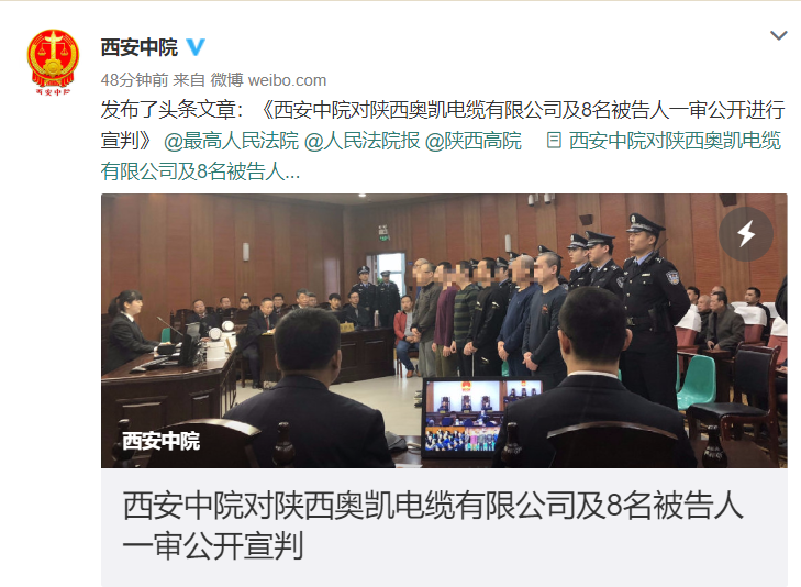 荔枝新闻讯 2019年3月29日,西安中院依法公开一审宣判被告单位陕西奥凯电缆有限公司及王志伟等8名被告人犯生产、销售伪劣产品罪,单位行贿罪,行贿罪一案。被告单位陕西奥凯电缆有限公司犯生产、销售伪劣产品罪,单位行贿罪,数罪并罚,决定执行罚金人民币3050万元;被告人王志伟犯生产、销售伪劣产品罪,单位行贿罪,行贿罪,数罪并罚,决定执行无期徒刑、剥夺政治权利终身,并处罚金人民币2150万元;其余7名被告人犯生产、销售伪劣产品罪,单位行贿罪,分别判处有期徒刑七年至十二年又三个月不等的刑期,并处罚金。