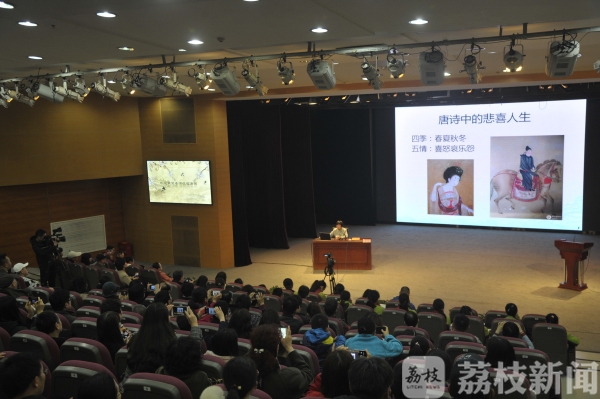 今天(3月30日)上午,中国诗词大会评委、著名隋唐史学者、《百家讲坛》主讲人、中央民族大学历史文化学院蒙曼教授应邀来到南京图书馆名家讲堂,畅谈“唐诗中的悲喜人生”,与前来的中小学生互动交流。