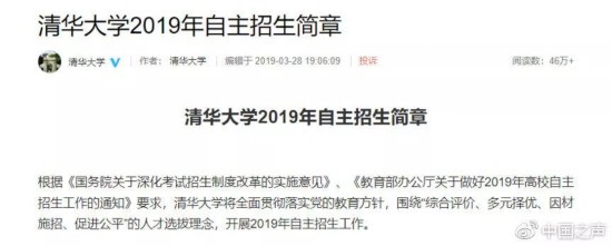 这两天最先引发广泛讨论的,是3月28日清华大学官微公布的2019自主招生简章。