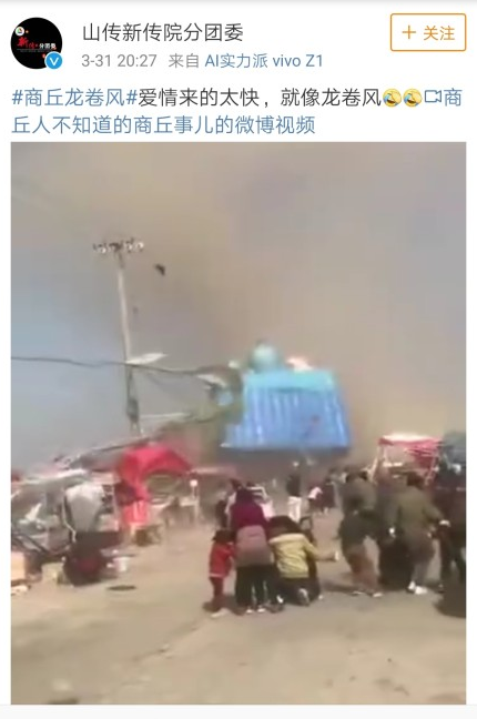 3月31日,山西传媒学院新闻传播学院分团委官方微博发文调侃河南商丘虞城尘卷风事件,遭到网友质疑,现已删除微博并道歉。