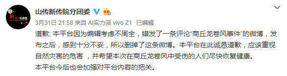 当日21时58分,@山西新传院分团委 删除了相关微博,并发文道歉:本平台因为编辑考虑不周全,错发了一条评论“商丘龙卷风事件”的微博,发布之后,感到十分不妥,所以删掉了这条微博。本平台在此诚恳道歉,应该重视自然灾害的危害 ,并希望本次在商丘龙卷风中受伤的人们尽快恢复健康。本平台今后也会加强对平台内容的把关。