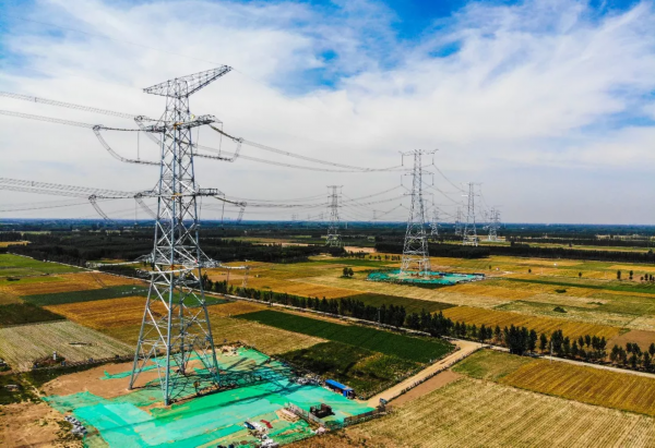 2018年6月29日无人机拍摄的投入运营的雄安新区1000千伏定河线迁改工程。新华社记者 李晓果 摄
