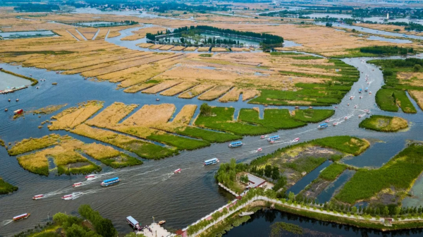 在位于河北雄安新区境内的白洋淀景区,游人乘坐游船欣赏美景(2018年4月30日无人机航拍)。新华社记者 沈伯韩 摄