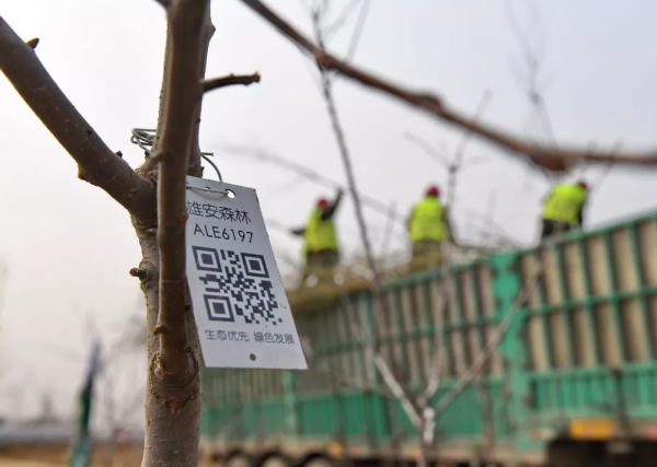 这是河北雄安新区“千年秀林”栽植苗木上的二维码(2018年3月21日摄)。 新华社记者 牟宇 摄