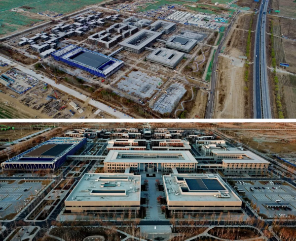 拼版照片:上图为2018年3月29日拍摄的正在建设中的雄安市民服务中心;下图为2018年12月7日拍摄的竣工并已投入使用的雄安市民服务中心。新华社记者 朱旭东 摄